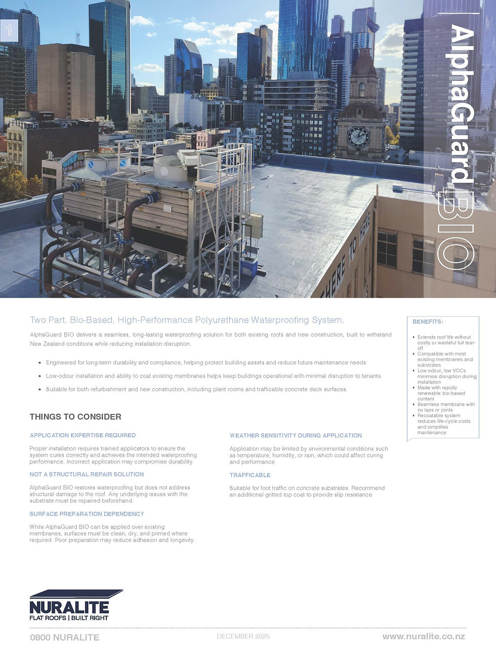 AlphaGuard BIO delivers a seamless, long‑lasting waterproofing solution for both existing roofs and new construction, built to withstand New Zealand conditions while reducing installation disruption.